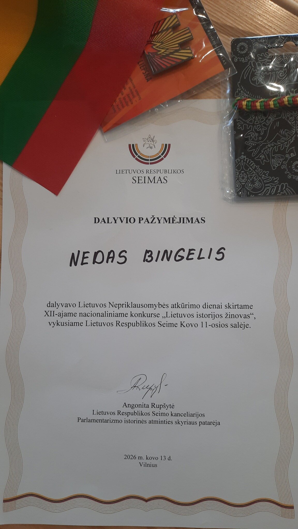 Norime pasidžiaugti, kad mūsų mokyklos mokiniui Nedui Bingeliui buvo suteikta galimybė pagilinti žinias apie Lietuvos istoriją.
