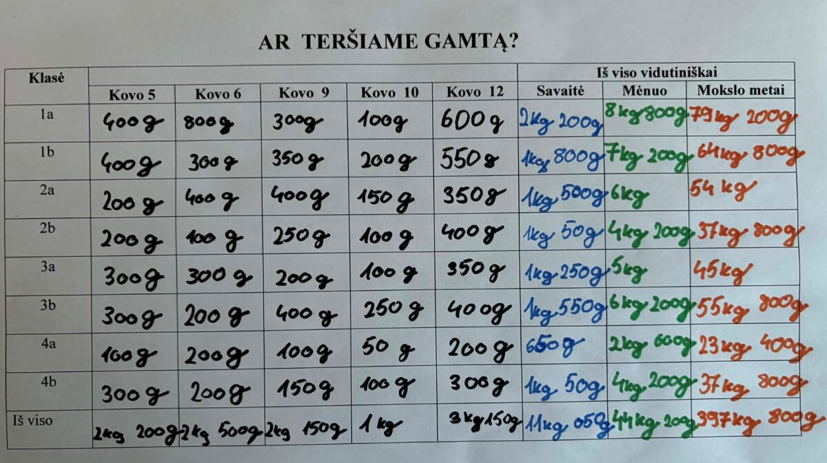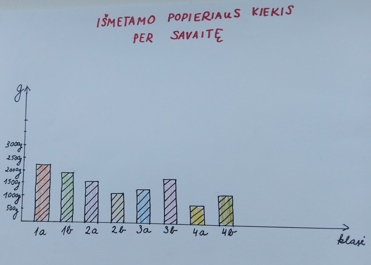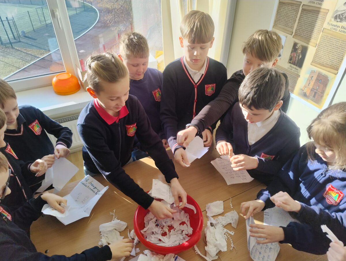 Pamokų metu mokiniai kalbėjo apie popieriaus kelią – nuo medžio iki sąsiuvinio, diskutavo, kodėl svarbu tausoti gamtą ir rūšiuoti atliekas. Trečiokai atliko tyrimą – keletą dienų rinko visų pradinių klasių jau panaudotą popierių, skaičiavo, kiek vidutiniškai popieriaus atliekų susikaupia per pasirinktą laikotarpį, braižė diagramas ir ieškojo būdų, kaip popierių panaudoti dar kartą.