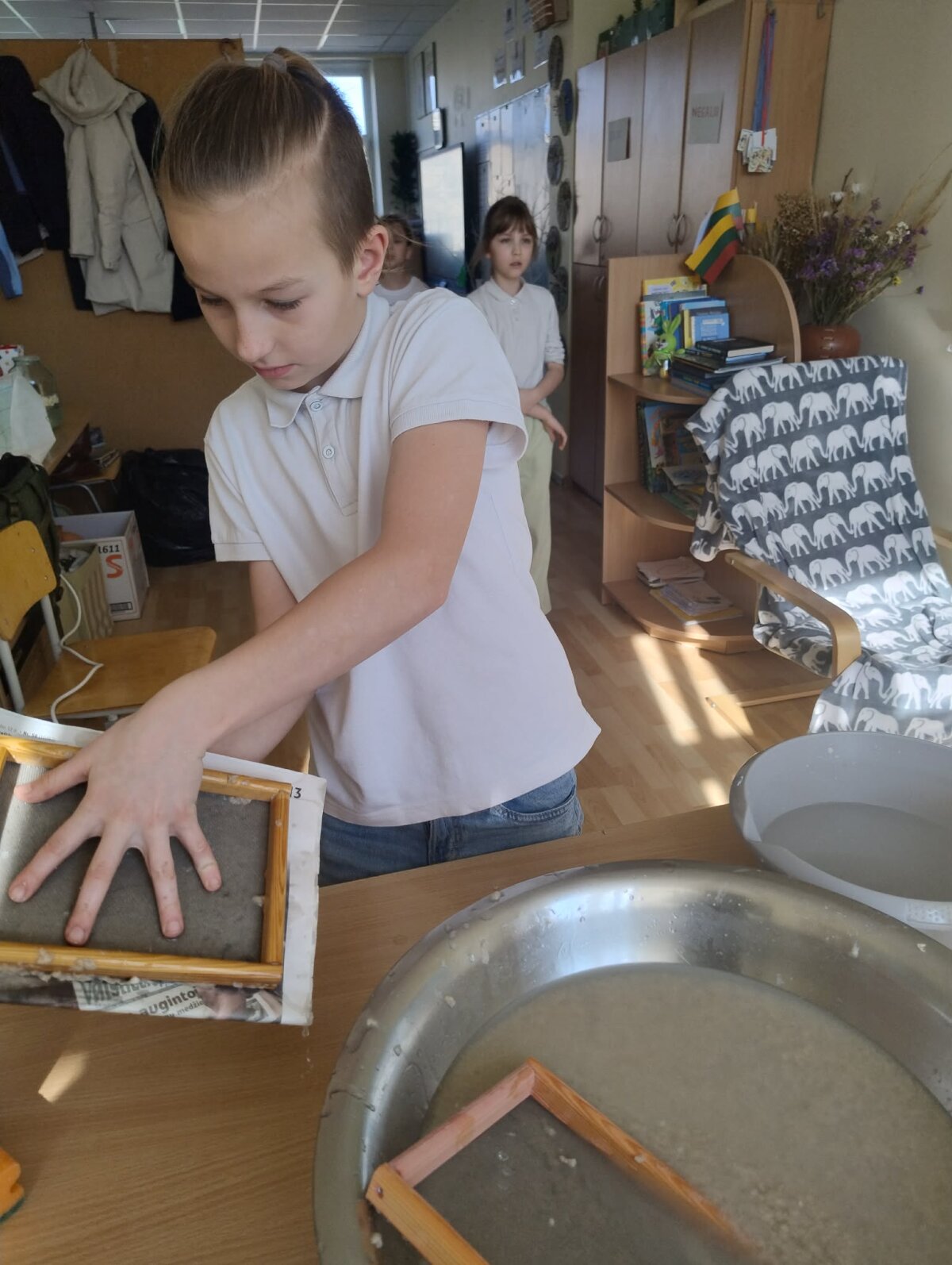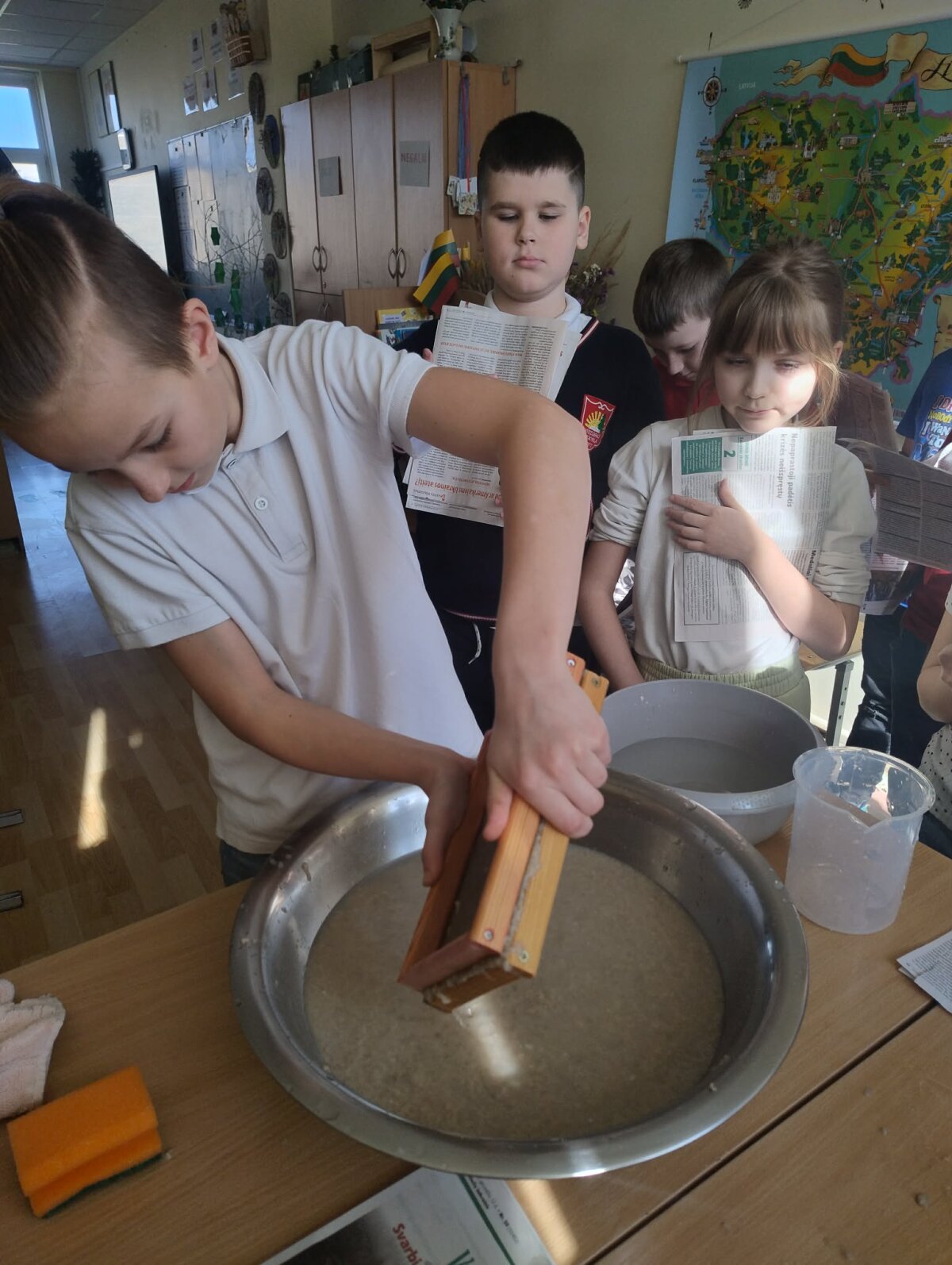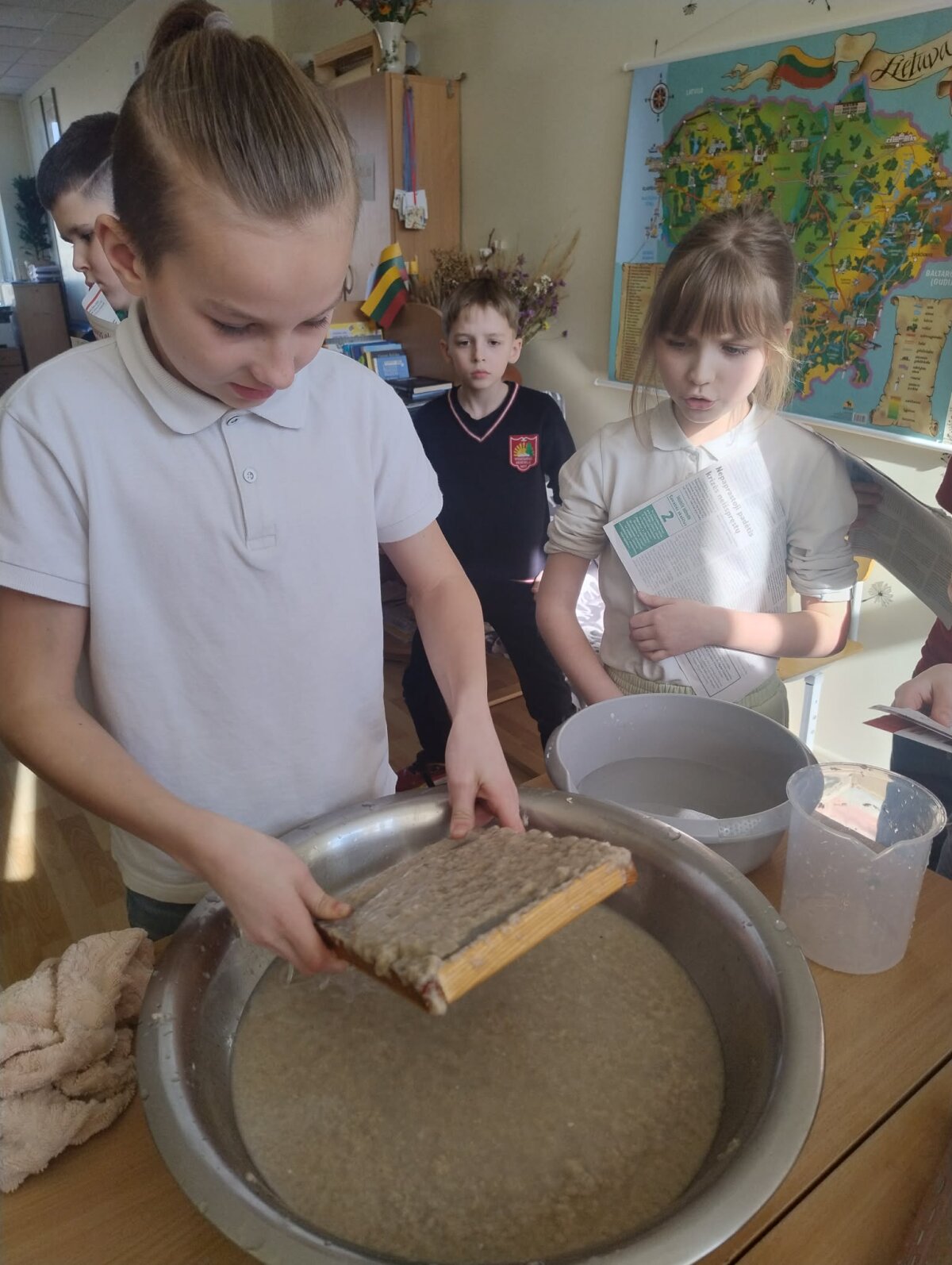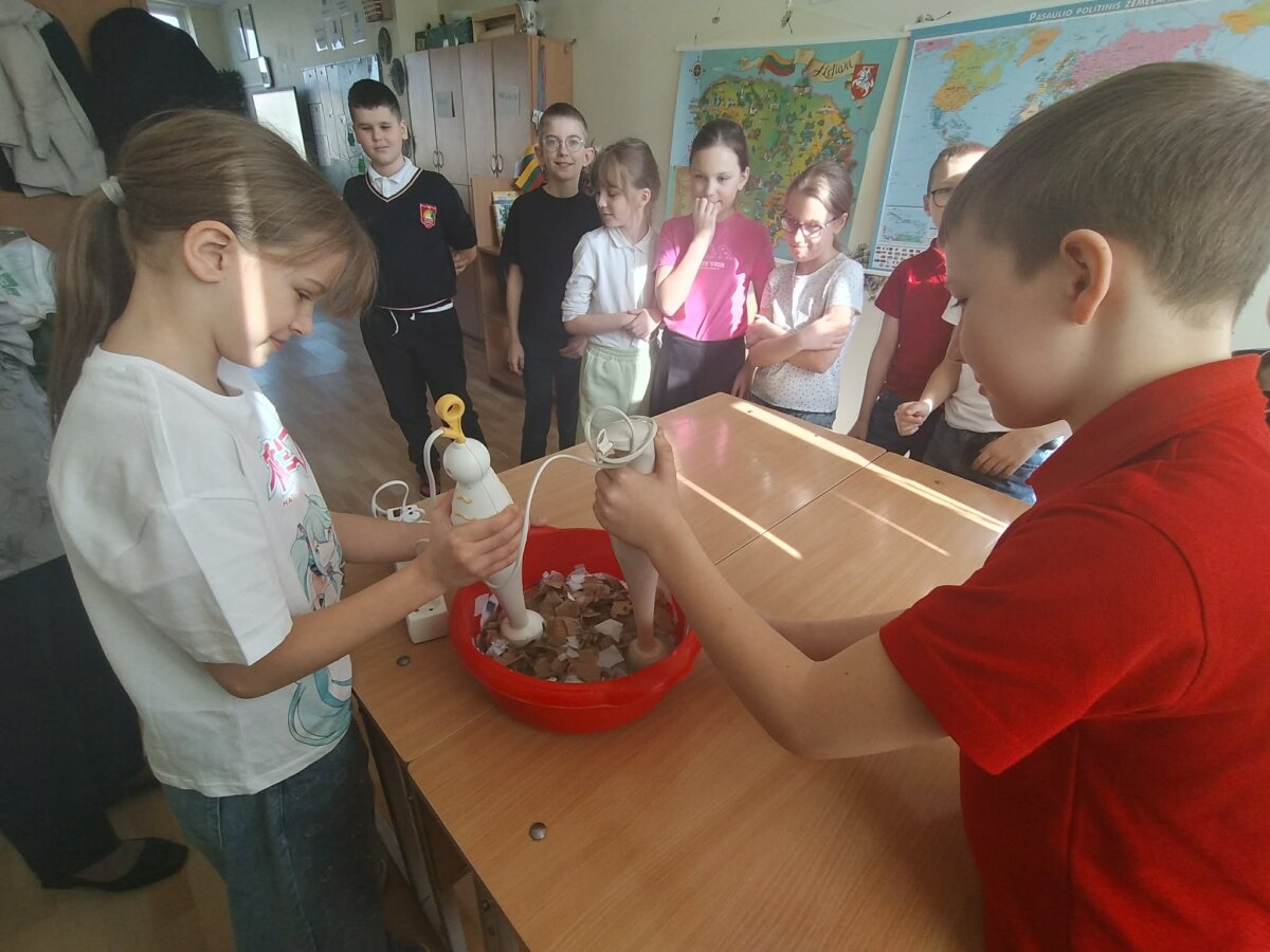 3b klasės mokiniai, padedami mokytojos Angelės Narkunienės ir mokinio padėjėjos Inesos Kazakevičiūtės – Večkienės, įgyvendino Žemės dienai skirtą kūrybinį ir prasmingą projektą „Popieriaus prikėlimas antram gyvenimui“.